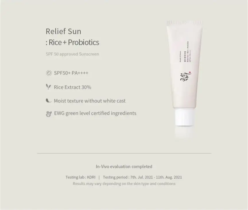 Relief Sun is a lightweight and creamy type organic sunscreen that's comfortable on skin. Even if you apply a large amount several times. it is not sticky and gives a moist finish like that of a light moisturizing cream. Containing 30% rice extract and grain fermented extracts. it provides moisture and nourishment to the skin.